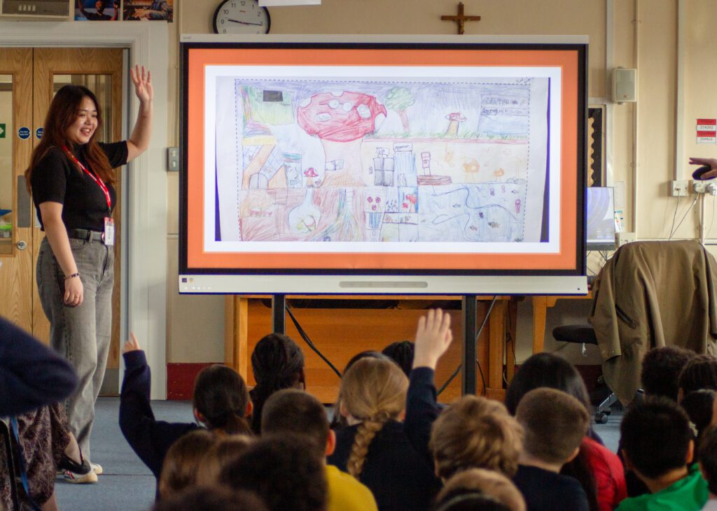 Sheppard Robson Architect Jing Zhi Tan presenting the reveal to Year 5 pupils.