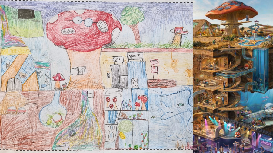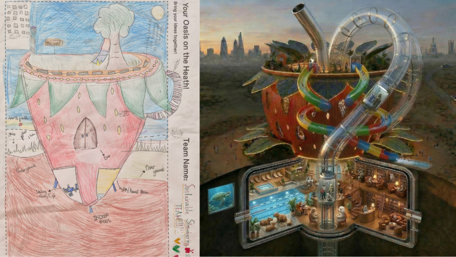A Year-5 team’s concept design (left) rendered by Sheppard Robson Architects using AI (right)